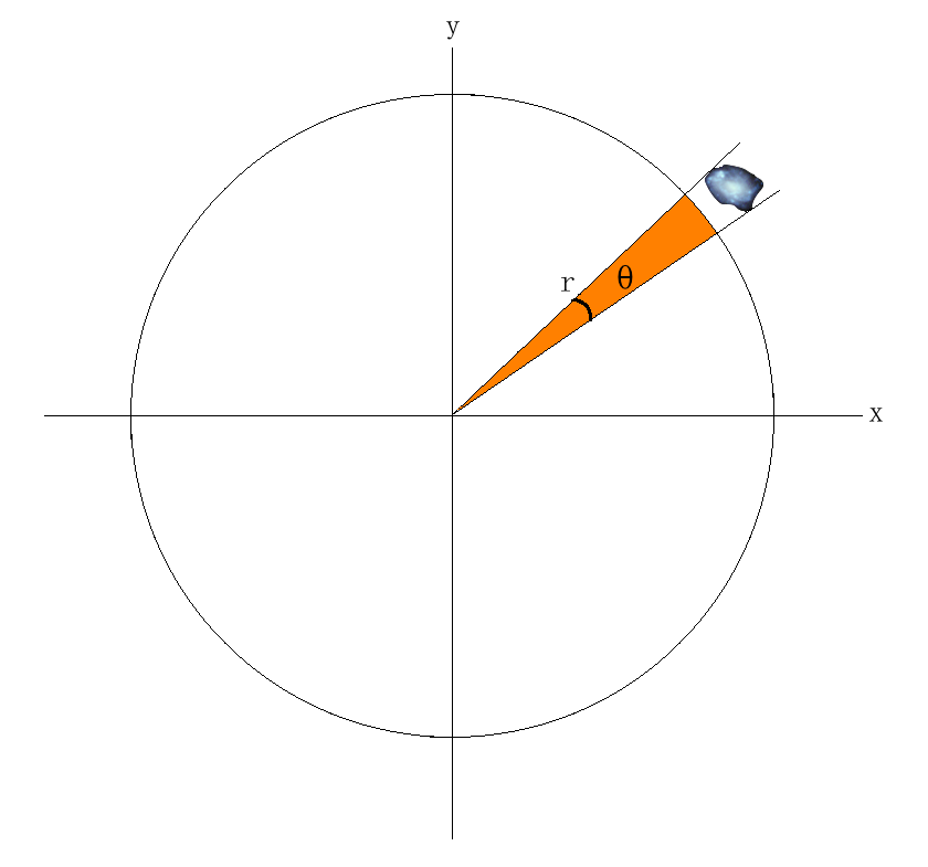 The image below depicts the observer at the origin (0,0) of the figure below with a radius , r, that corresponds to the distance to some astrophysical object, and the angle θ is the angular size of said object. Let us now solve for the mathematical relationship, along with unit conversions, that show explicitly how an angular size translates to a physical size for some distance r away from the observer.