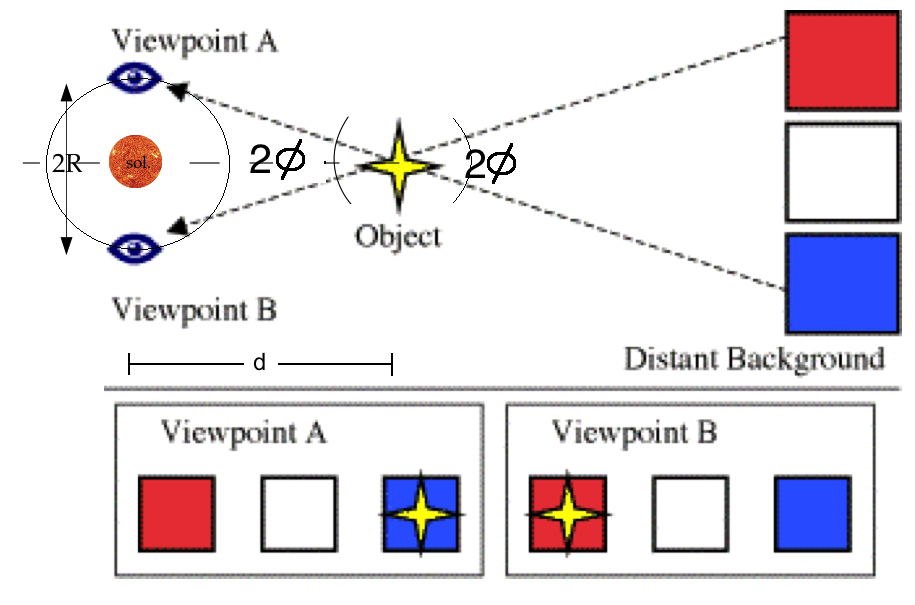 Measuring distances to astrophysical objects is, in general, a tricky business that depends greatly on the scale of the distance you wish to know (See the Cosmic Distance Scale page). For stars that are close by we can use a method known as stellar parallax. Stellar parallax is a method of measuring the distance to nearby sears by using straightforward geometry. If we wish to know the distance to a close star all we need to do (in theory) is observe it two times in one year separated by 6 months (Viewpoint A and Viewpoint B in the diagram below). Since we know the distance from the earth to the sun, our triangle has a base that is two times this distance. The angle φ is measured by looking at how the star of interest shifts in the sky when compared to stars at a much further distance, which appear to remain fixed. (The reason the figure shows an angle of 2φ is because our convention is to assign φ to the angle subtended by the radius of the Earth's orbit around the Sun ("R" in the figure) rather than the angle subtended by the diameter as indicated.) This technique is powerful because it is a direct measure of distance to a star, but is limited by how well we can detect the apparent shift of a star against the background field of stars. This minimum detectable shift sets the furthest distance that can be measured using this technique, since as objects get farther away the apparent shift, φ, decreases.